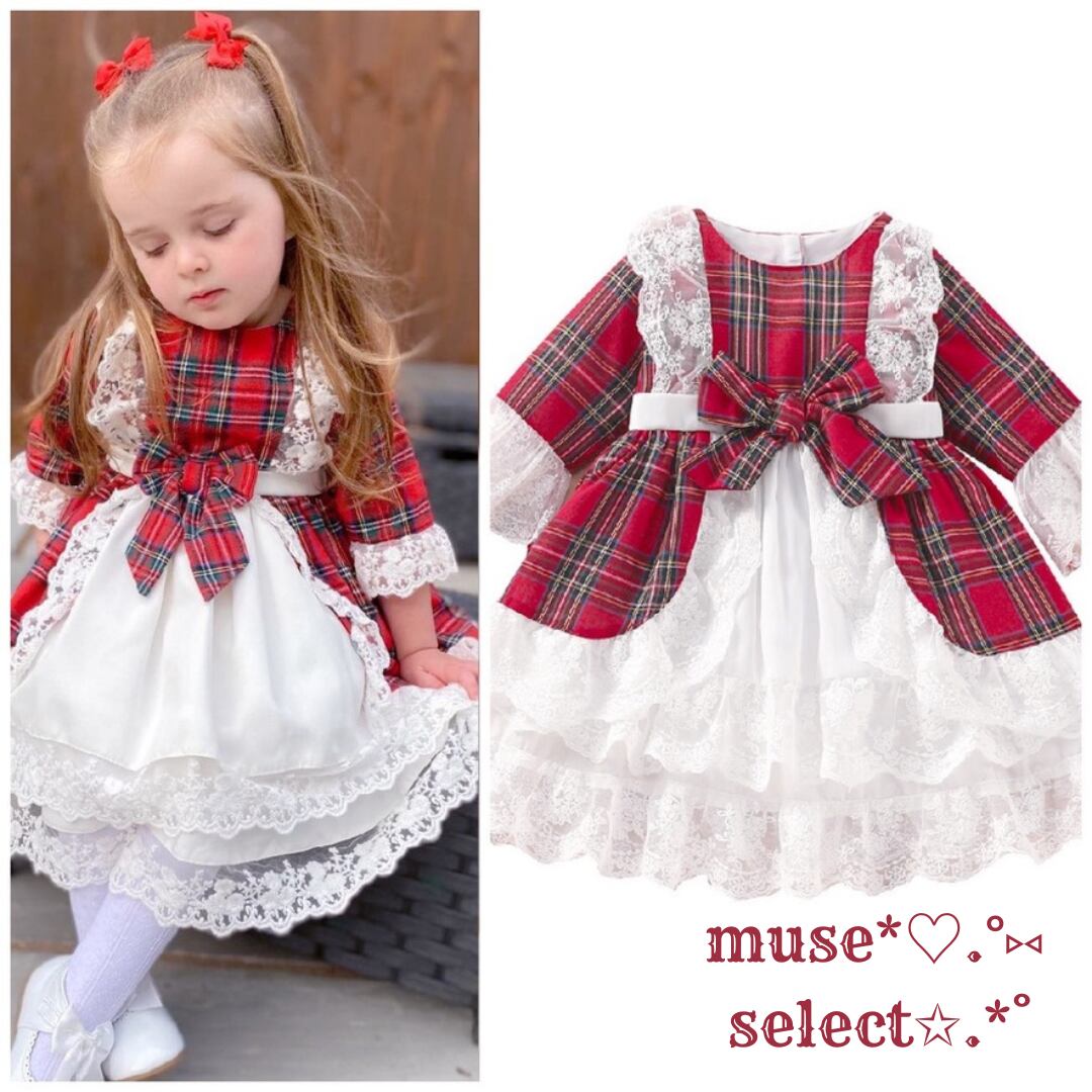 【即納】80/90/100/110/120/130 赤 タータンチェック ワンピースドレス 女の子 子供 ワンピース リボン レース フリル 綿 コットン 北欧 大人かわいい おしゃれ 韓国子供服 インポート キッズ プリンセスドレス ピアノ発表会 結婚式 七五三撮影 フォーマルドレス ハロウィンコスプレ クリスマス サンタクロース サンタワンピース トナカイ ロリータ アイドル 春秋冬 七分丈 長袖