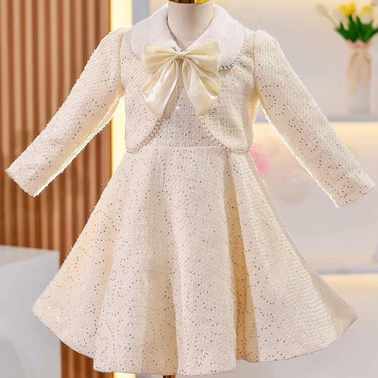 【即納】110cm女の子♥白ツイードフォーマルスーツセットアップ♥クリーム色 ホワイト♥ジャケット ジャンパースカート ワンピース ジャンスカ♥入学式 入園式 卒園式 結婚式 フォーマル♥ピアノ発表会七五三お祝い♥ふわふわファー裏起毛裏ボア♥韓国キッズ
